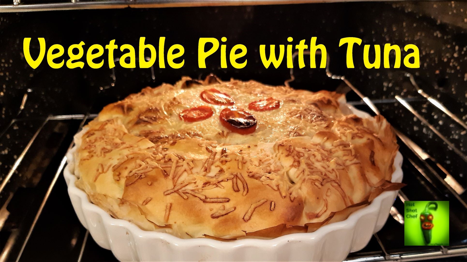 Roll out the pastry, if not pre-packed, and line a slightly smaller dish before pricking the base and laying in the sliced vegetables and eggs. Pour the Tuna mix over the veg and turn the spare pastry onto the top. Brush this with beaten egg or milk and place in a hot oven 220C and then reduce the heat to 180C.